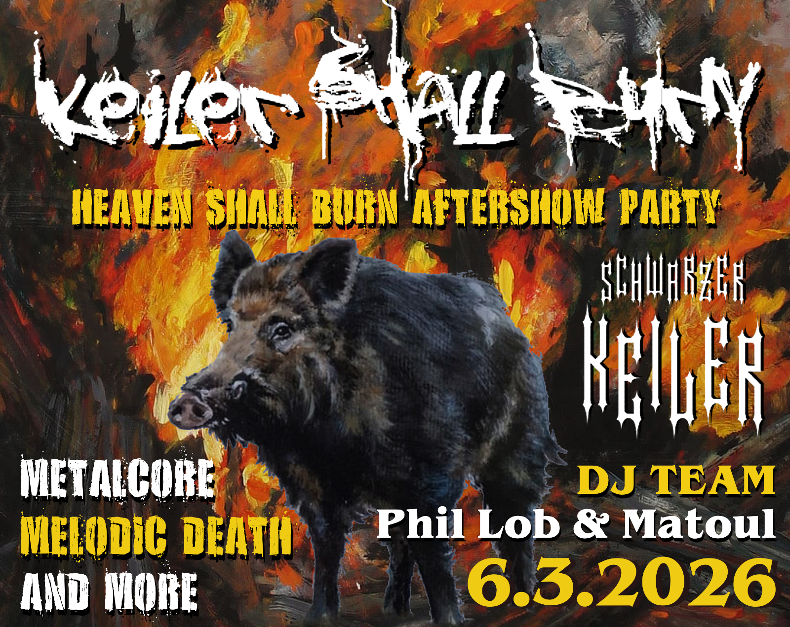 Die Tanzfläche vom Keiler soll brennen! In dieser Partynacht vereinen sich die geballten Kräfte zu einer intensiven Mischung aus Metalcore, Melodic Deathmetal und weiteren Extreme Metal Genres. Ein Feuer wird entfacht und die Flammen werden um sich schlagen. Keiler Shall Burn!